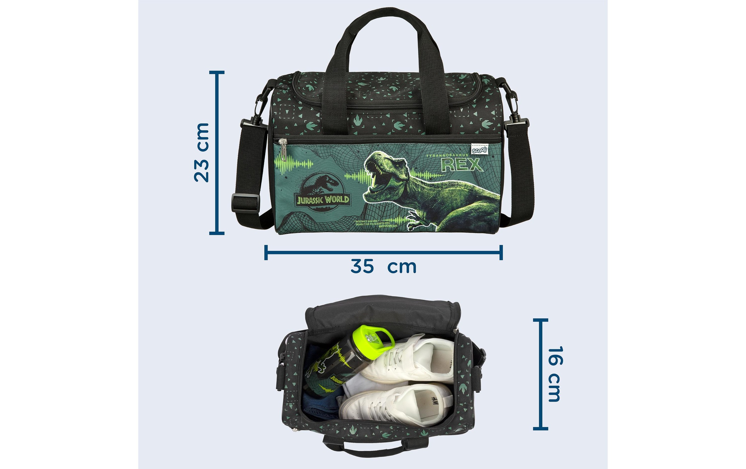 Scooli Turnsack. Abnehmbarer und verstellbarer Schultergurt. Gefertigt aus Polyester. Grosses Hauptfach und kleines Reissverschlussfach auf der Vorderseite. Masse: 33 cm Breite x 22 cm Höhe x 10 cm Tiefe. Volumen: ca. 8 l. Zwei Tragegriffe mit Klettverschlussverbindung.