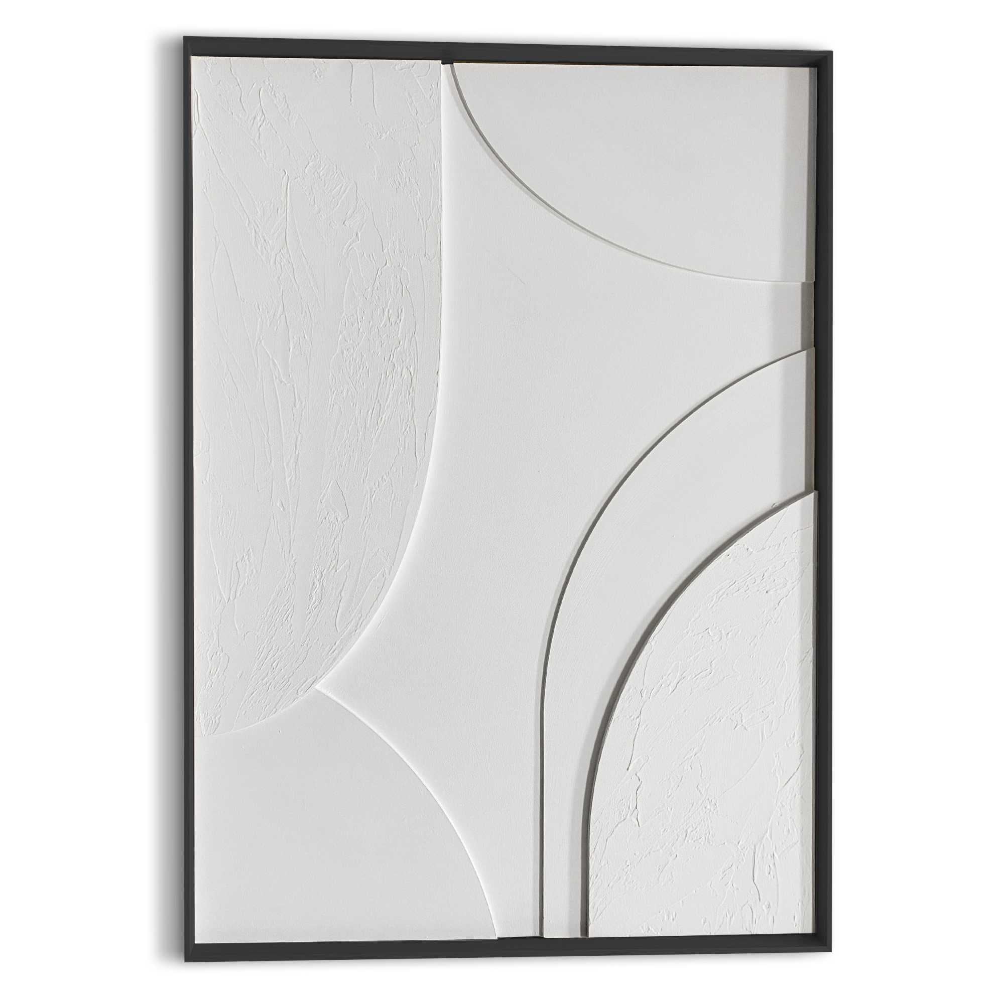 Handgefertigter Wanddeko mit abstraktem Relief in weissem Gips, eingerahmt von einem rahmen. Der skandinavische Minimalismus mit 3d-Textur passt zu den meisten modernen Wohnstilen wie Basic, Vintage, Urban oder Industrial.