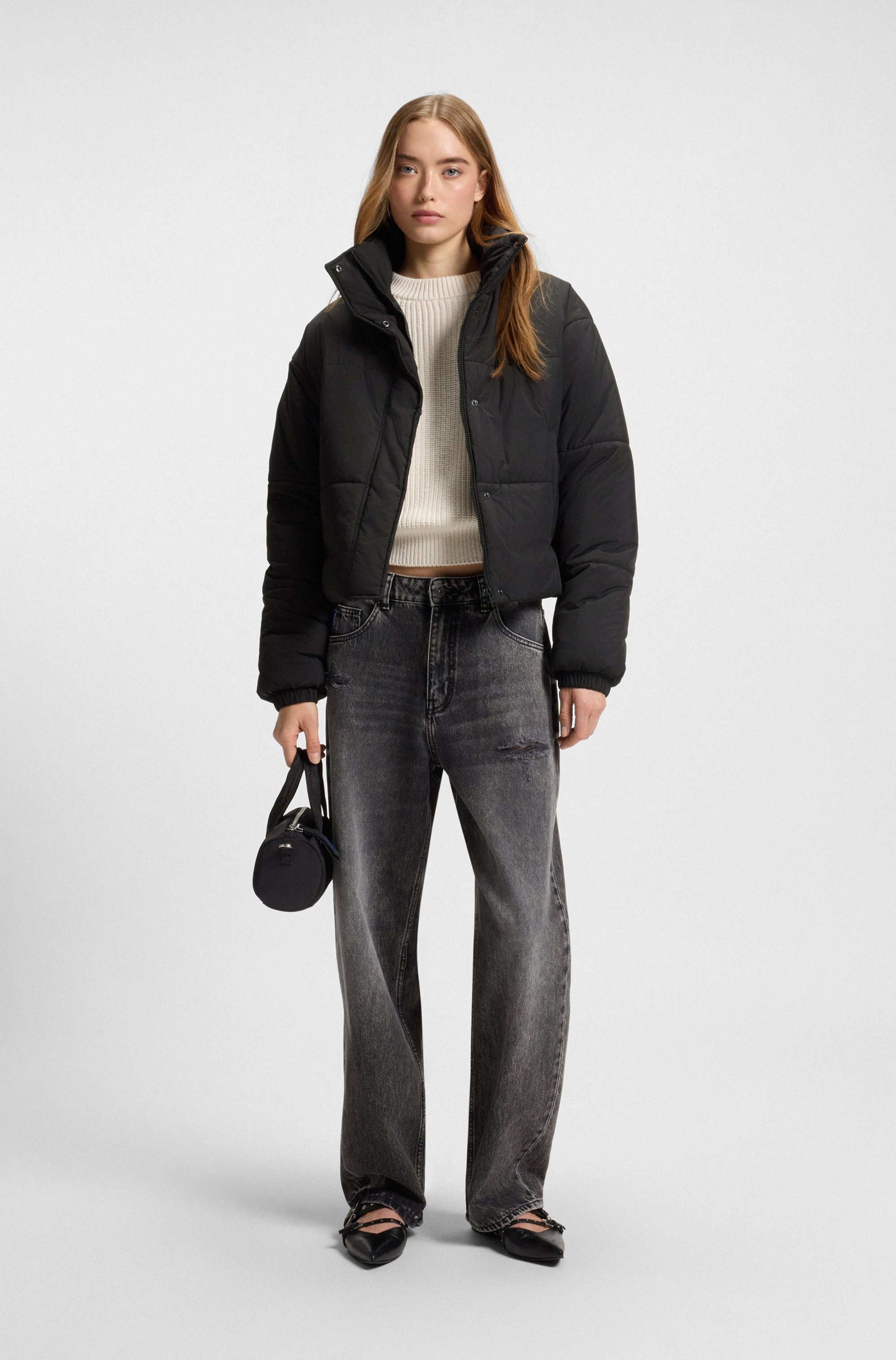 Wenn die Temperaturen sinken, hat die Steppjacke für Frauen von HUGO Blue ihren grossen Auftritt. Die Jacke mit Stehkragen ist kurz. Die langen Ärmel haben einen elastischen Bund. In den Eingrifftaschen lassen sich kleine Gegenstände verstauen. Aufgelockert wird der Look mit einem Badge. Die Steppjacke aus Webstoff ist sehr leicht und fühlt sich daher luftig auf der Haut an. Sie eignet sich für Ausflüge an der frischen Luft oder den Weg zur Arbeit.
