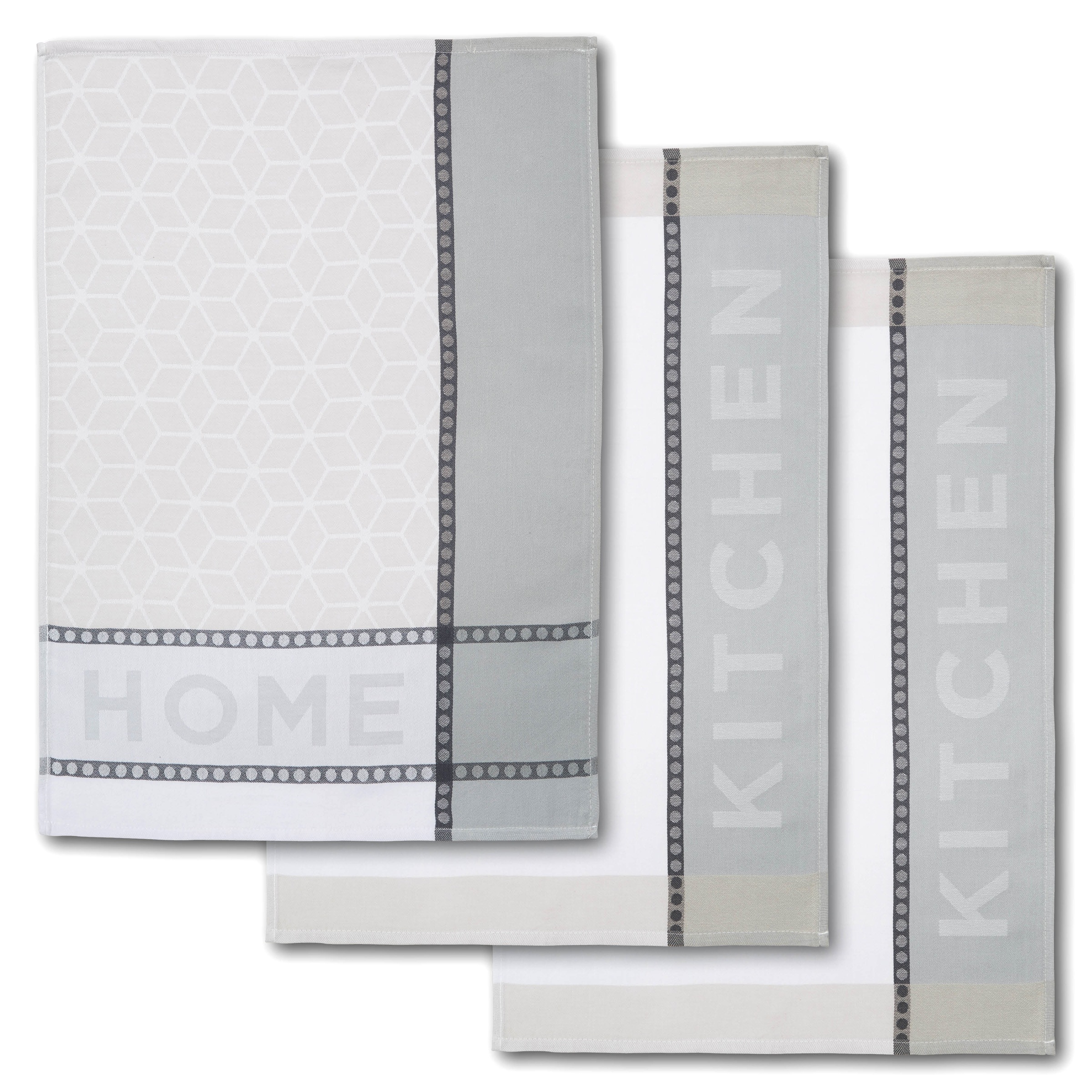 Verleihen Sie Ihrer Küche einen modernen und stilvollen Look mit dem HOME & KITCHEN Geschirrtuch Set der Marke Dyckhoff. Es besteht aus drei harmonisch aufeinander abgestimmten Geschirrtüchern in modernem Look. Jedes Design setzt ein stilvolles Statement: Ein Tuch hat den Schriftzug „HOME“, während die beiden anderen den Schriftzug „KITCHEN“ tragen.