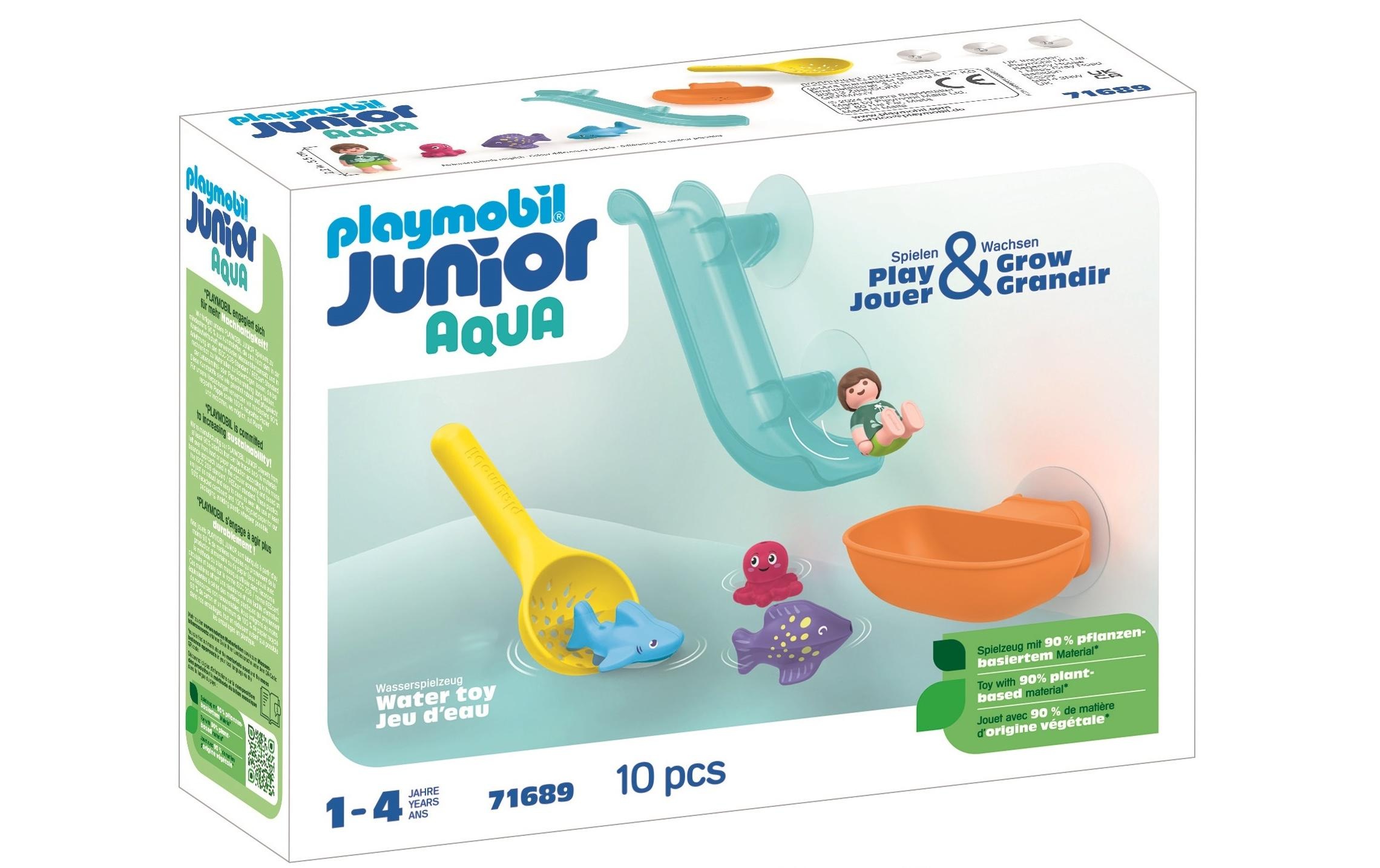 Playmobil Junior Aqua & Tinti: Bunter Tintenfisch 71438. Abnehmbare Sicherheitskammer für die Badetablette mit Dreh-/Drück-Mechanismus. Altersempfehlung ab: 1 Jahr. Aufsteckbarer, transparenter Becher zur Veranschaulichung des eingefärbten Wassers. Drei Tinti-Badetabletten in Grün, Türkis und Lila mit Erdbeerduft. Tintenfisch mit Farbpunkten auf den Armen zum Farbsortieren. Vier Farbringe und zwei farbige Schwimmringe zum Aufstecken auf die Tintenfischarme.