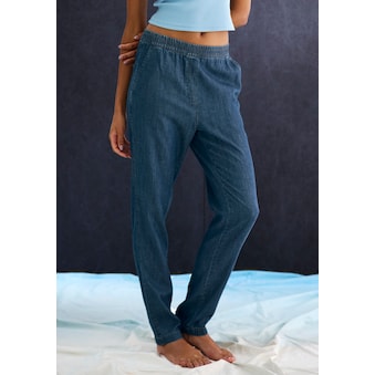 Unifarbene Basic-Schlupfhose von H.I.S in Denim-Optik. Weites Bein. Legere, bequeme Passform. Für Freizeit und Sport. Weiche, leichte Materialmischung mit Baumwolle.