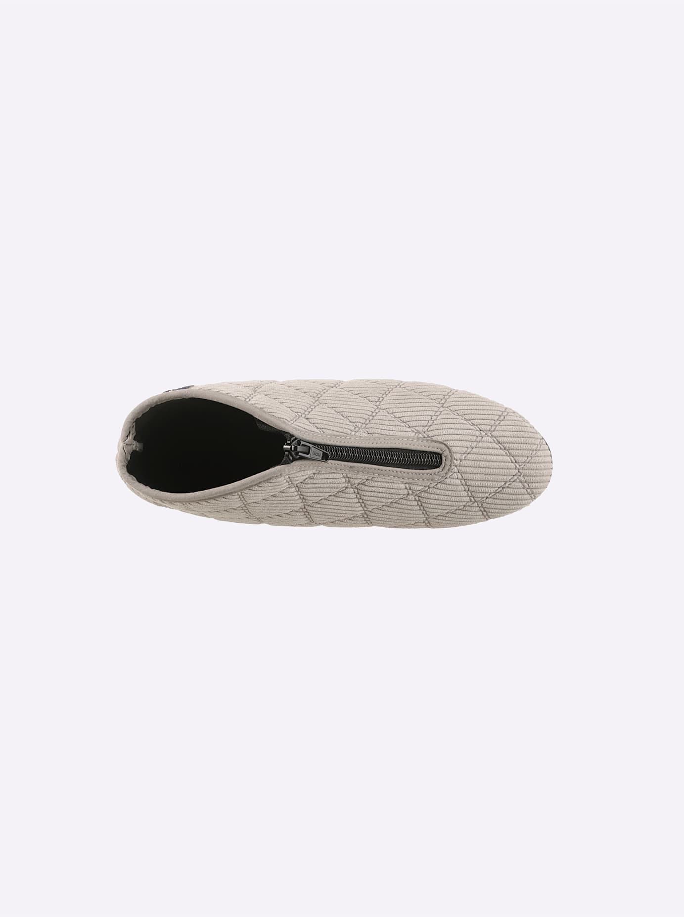 Hausschuh mit modischem Rauten-Stepp. Durch den Reissverschluss vorne lässt er sich besonders leicht an- und ausziehen bzw. weit öffnen. Gummi-Laufsohle, ca. 20 mm Absatz. Weite G.