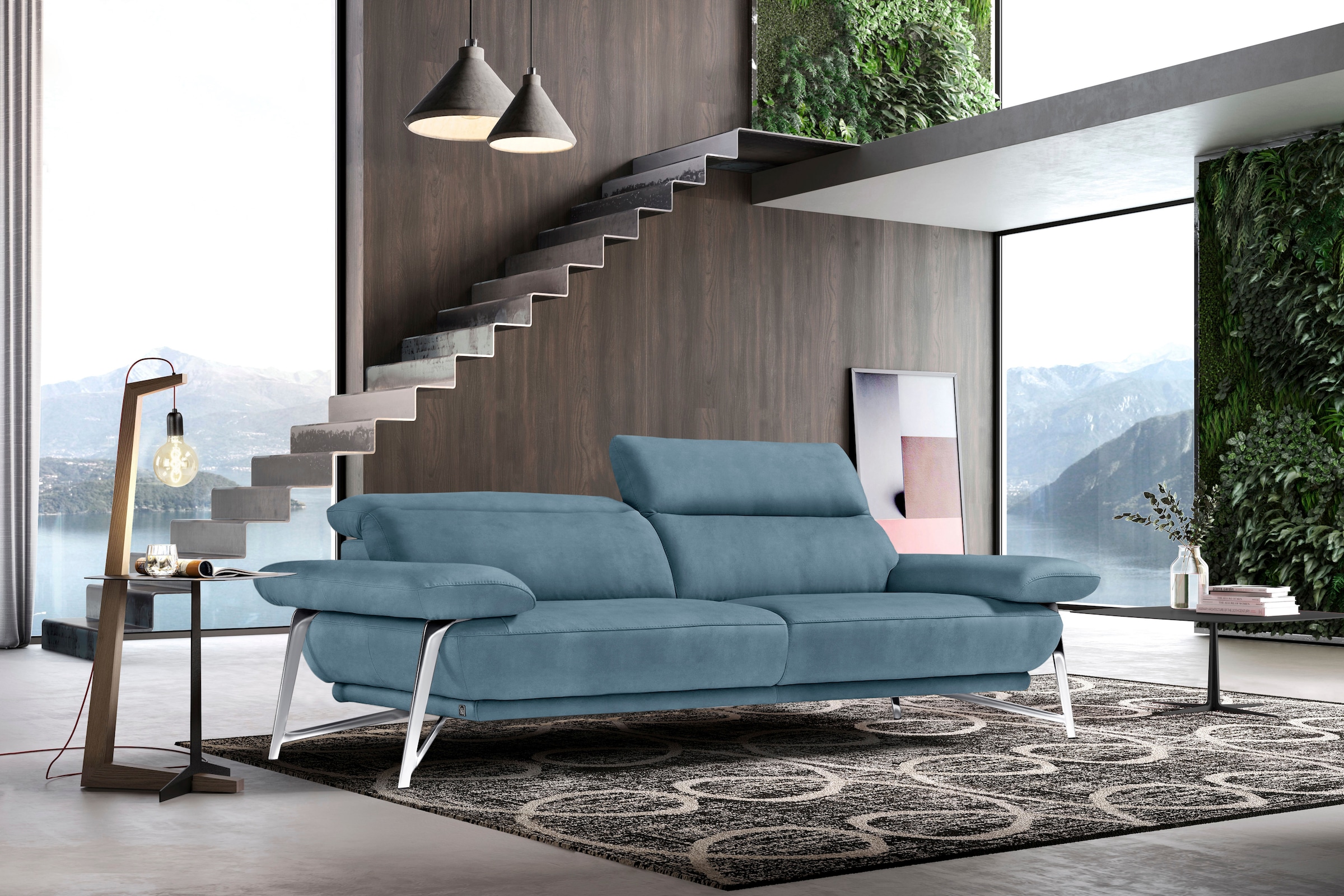 Egoitaliano 2,5-Sitzer »Anais, Designsofa mit erstklassigem Sitzkomfort, Fussfarbe chrom« Kopfteil verstellbar, 232 cm, Luxus-Microfaser Lederoptik, hellblau