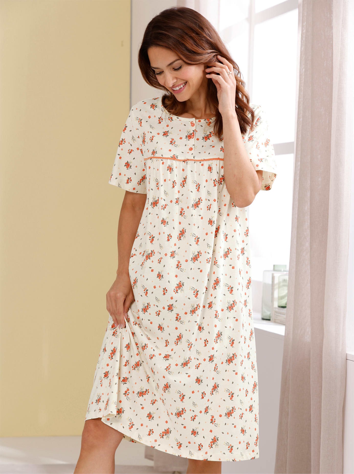 Klassische Eleganz im attraktiven Farbkontrast: Nachthemd mit duftigen Flügel-Ärmeln und breiter Spitzenborte. Tiefer Herz-Ausschnitt mit kontrastfarbener Satinband-Einfassung. In weicher Single-Jersey-Qualität. 50% Baumwolle, 50% Modal.