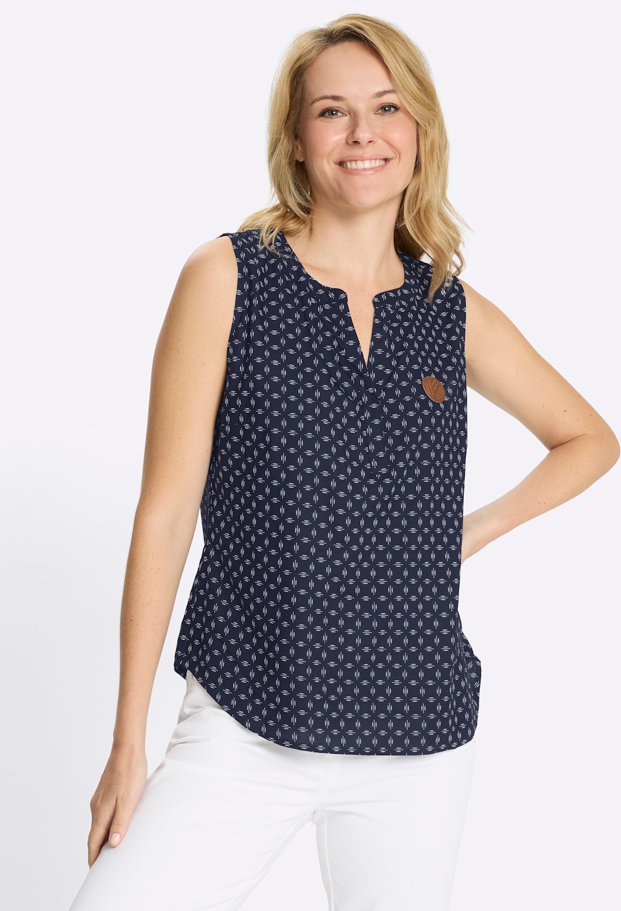 Blusentop RH-Ausschnitt mit offenem V, allover bedruckt mit MInimal-Muster, leicht abgerundeter Saum, aufgesetztes Lederimitat-Patch auf der Brust. fliessender Fall. Brustabnäher. 100% Viskose. Maschinenwäsche.
