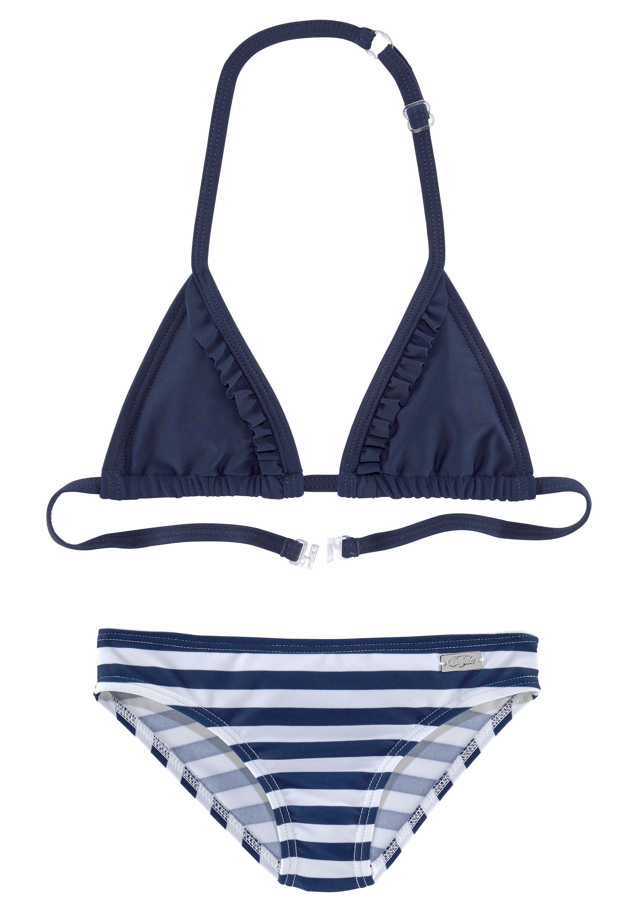 In zweifarbiger Optik mit gestreifter Hose. Regulierbares Top mit kleiner Rüsche, Träger im Nacken verstellbar. Bikini vorn gefüttert.