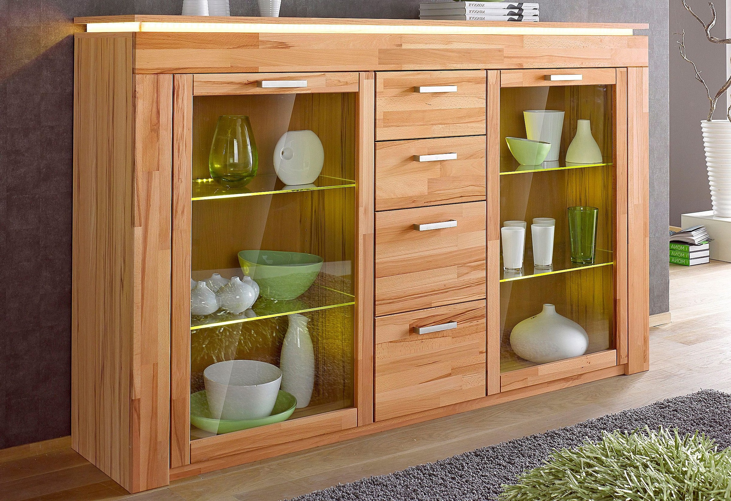 Wissenswertes | Highboard mit einer Front aus Massivholz und einem Korpus aus Kunststoff Nachbildung. Links und rechts befindet sich jeweils eine Glasrahmentür mit je zwei Glaseinlegeböden. Mittig vier Schubkästen auf Metallführung. Oberplatte mit Schattenfugen für LED-Stripes. In folgenden Farben erhältlich: