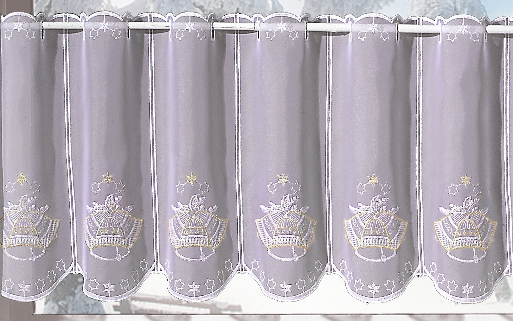 Für eine sinnliche Weihnachtszeit sorgt die reichaltig bestickte Scheibengardine »Glocke« aus dem Hause Stickereien und Textilien Plauen. Echte Plauener Stickerei gesickt auf einem Transparentem Voile sorgt für ein wunderschönes Wohnambiente. Das pflegeleichte Material ist in der Maschine waschbar. Mit dem leichten Glanz des Polyestergarnes wird ein stilvolles Ambiente an Ihrem Fenster geschaffen.