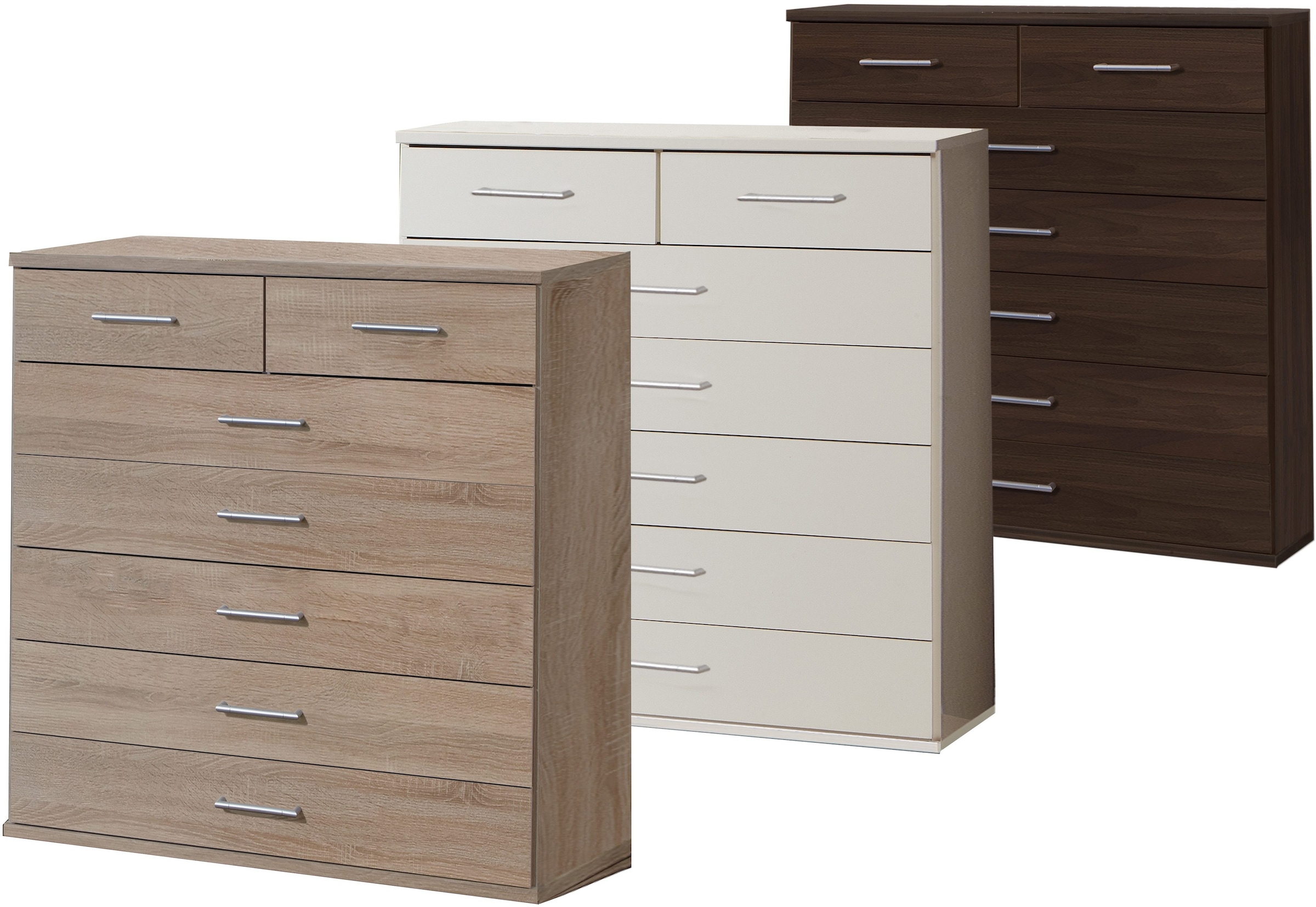 Wissenswertes | Pflegeleichte Kunststoffoberfläche. In 2 Farben. Mit 2 kleinen und 5 grossen Schubkästen. Griffe silberfarben, aus Kunststoff. Schubkasteninnenmasse (B/T/H): je 36,5/30/ 12 cm bzw. 84/30/12 cm. Schubkästen auf Metalllaufleisten.Innendekor Leinen grau. Gesamtmasse (B/T/H): 91/40/103 cm. Alles ca.- Masse. Mit Aufbauanleitung. |
