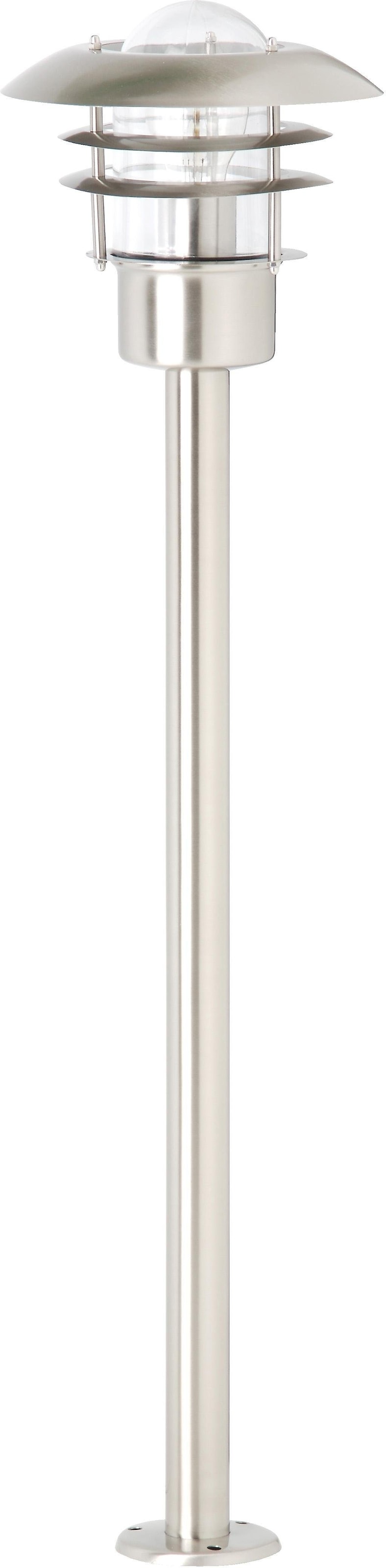 Brilliant Aussenleuchte, 1 flg., Stehleuchte, »TERRENCE«. Klassische Aussenleuchte/Stehleuchte aus Metall/Glas. Geeignet für Leuchtmittel E27, max. 60 Watt (im Lieferumfang nicht enthalten). Die klassische skandinavische Form dieser Leuchte ermöglicht eine nahezu blendfreie und gleichmässige Ausleuchtung aller wichtigen Aussenbereiche. Geschützt wird das innen liegende Leuchtmittel durch eine stabile Klarglaskuppel. Die Leuchte ist geeignet für den Einsatz von LED-Leuchtmitteln und erfüllt alle Bedingungen des hohen IP44-Schutzgrads gegen das Eindringen von Wasser und Staub. Weitere Details: 1-flammig, Stehleuchte, Metall, edelstahlfarben, Glas, klar, Höhe 90 cm, Durchmesser 22 cm, Passendes Leuchtmittel 1 x E27, max. 60 Watt, Auch für LED-Leuchtmittel geeignet, Lieferant: Brilliant, Lieferanten-Artikel-Nr.: 45785/82.