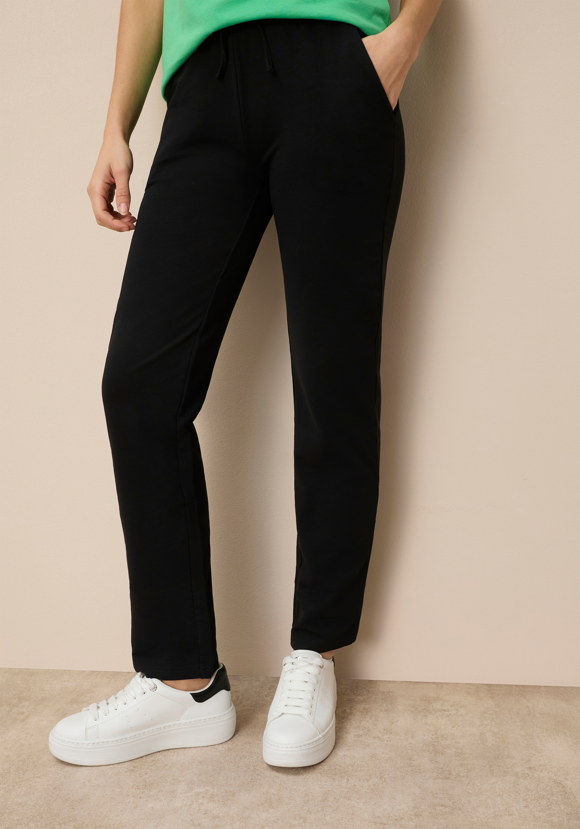 Applizierter Streifen an der Seite. Seitliche Eingrifftaschen mit Zipper. Elastischer Rippbund mit Tunnelzug und Aussenkordel. Weiche Sweatware.