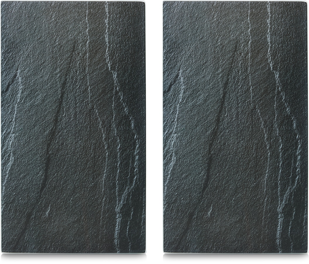 Zeller Present Herdabdeck-/Schneideplatten »Schiefer«, 2-er Set, 30 x 52 cm. Diese modernen Platten aus hochwertigem Glas können nicht nur als Schneideplatten, sondern auch als Herdabdeckung verwendet werden. Sie überzeugen durch Ihre Funktionalität und Optik. Die praktischen Küchenhelfer stellen Ihnen zusätzlichen Arbeitsplatz zur Verfügung und können zum Abdecken von Kochfeldern und Spülen sowie zum Schneiden, Vorbereiten und Servieren verwendet werden. Sie sind nahezu unzerbrechlich und hitzebeständig. Trotzdem empfehlen wir Ihnen, die Platten nur auf abgekühlten Kochfeldern zu verwenden. Die eleganten Haushaltshelfer sind hygienisch und äusserst schnittfest. Sie werden mit 6 rutschfesten Elastikfüssen pro Platte geliefert. Fusshöhe ca. 0,3 cm. Material: Glas. Masse je Platte: ca. 30 x 52 x 0,8 cm.