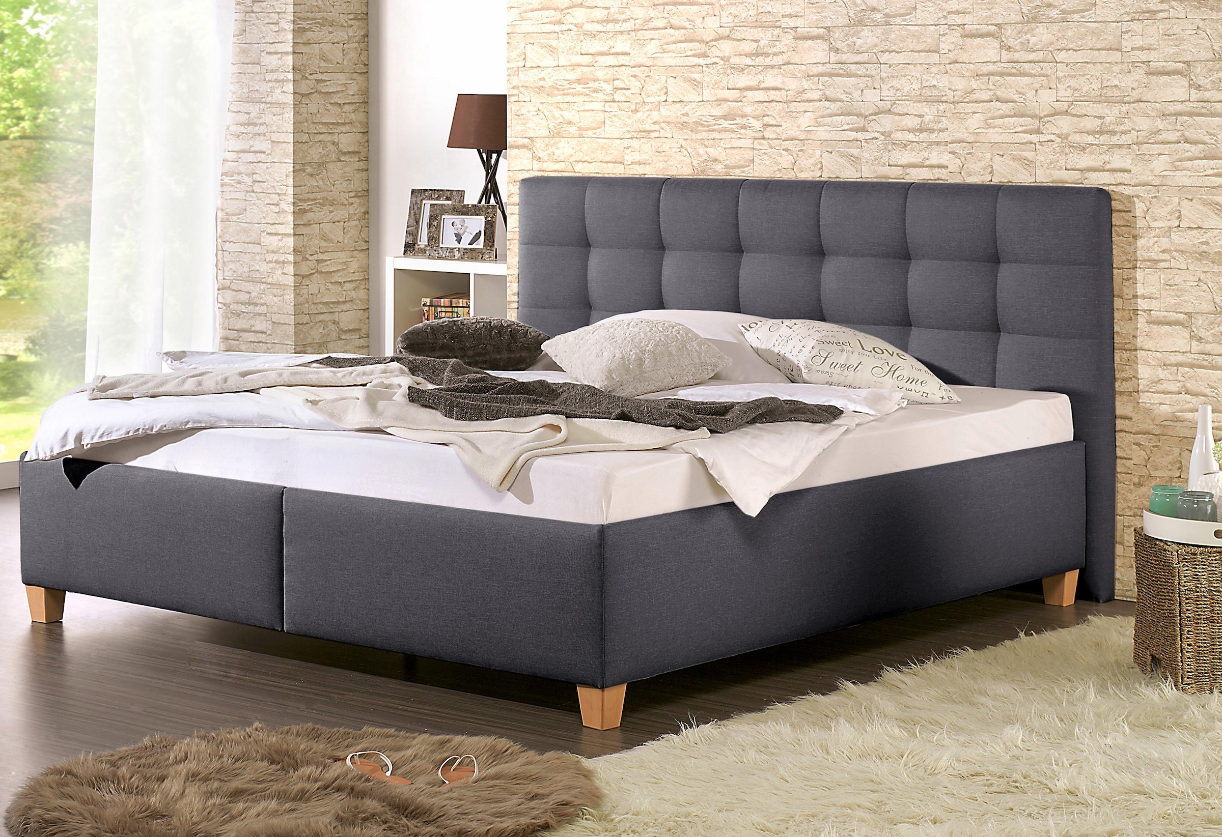 Wissenswertes | Polsterbett mit ca. 10 cm starken, softig aufgepolsterten Kopfteil mit dekorativer Karosteppung. In vier Farben, fünf Grössen und drei Ausführungen. Bezug Strukturstoff (100% Polyester). Holzfüsse, buche geölt, ca. 9 cm hoch Details: