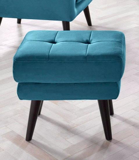 Hocker mit Knopfheftung und hohen konischen Füssen aus Holz. Passend zu den Sesseln und Sofas aus der Serie »Hemmink«.