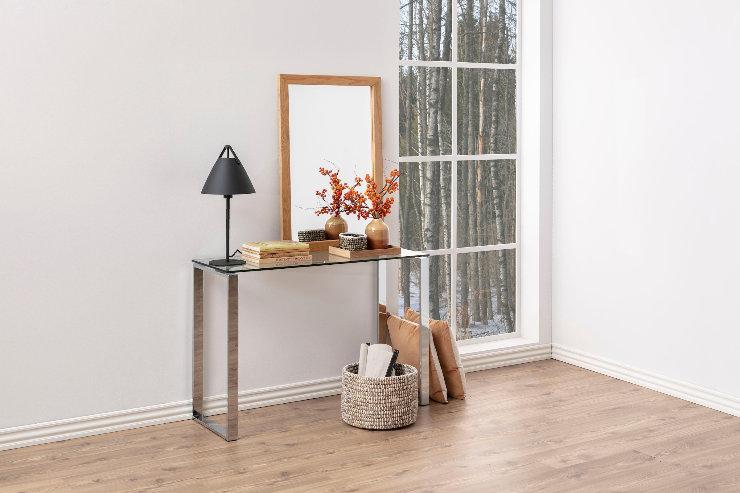 Der klassische Konsoltisch Karina lässt sich dekorativ nach Ihrem Geschmack und Bedarf in Ihrer Einrichtung platzieren. Der 10 mm Tischplatte aus klarem Glas steht auf einem stabilen Gestell aus verchromtem Metall. Der zeitlose Tisch hat eine pflegeleichte Tischplatte. Der Karina Konsoltisch ist insgesamt klassisch, modern und pflegeleicht.