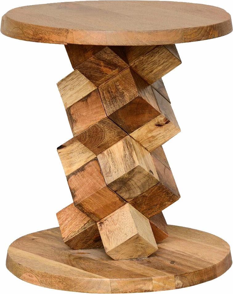 Extravagantes Kleinmöbel: Der Beistelltisch »Battle« von Home affaire im kubischen Design ist ein Hingucker. Die Säule des Tisches scheint aus zahlreichen übereinander gestapelten Würfeln zu bestehen. Diese kubische Säule bildet einen schönen Kontrast zu der Tischplatte sowie dem Fuss, die beide rund sind. Aufgrund seiner aussergewöhnlichen Optik wird er zum Hingucker im Raum. Zudem überzeugt das Möbelstück durch seine Qualität: Der Tisch ist aus FSC®-zertifiziertem Mango-Massivholz gefertigt. Der Beistelltisch »Battle« von Home affaire im kubischen Design ist ideal für den Wohn- oder Schlafbereich sowie für den Eingangsbereich geeignet.