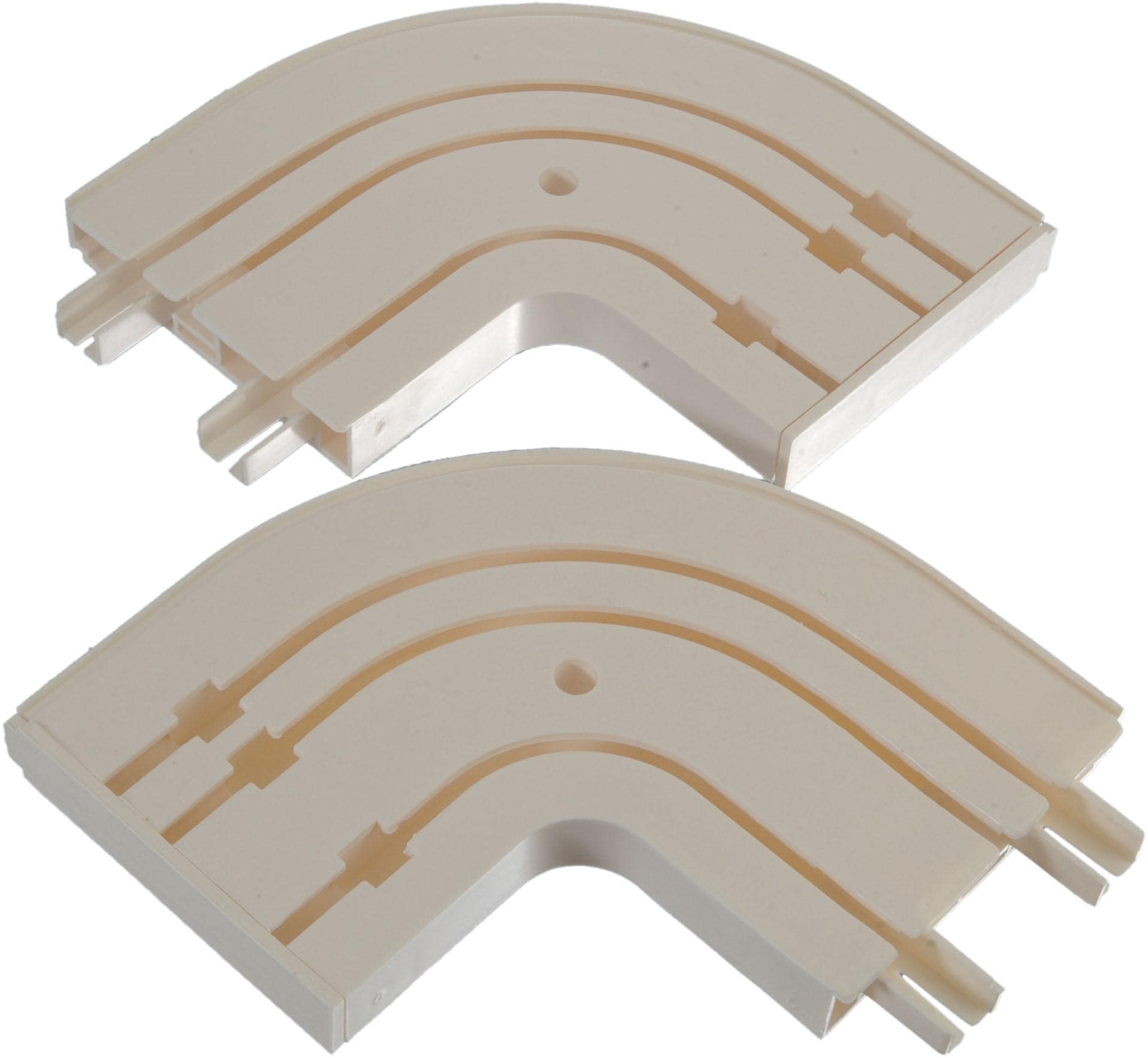 Gardinenschienen erfreuen sich grosser Beliebtheit, da sie flexibel, vielfältig, aber dezent einsetzbar sind. Mit den entsprechenden Bögen können die Gardinen auch um Ecken und Erker geführt werden. Die Verbindung zur geraden Schiene wird durch ein Stecksystem gewährleistet. Passendes Zubehör mit dem 6 mm Laufkanal finden Sie in weiteren Angeboten. Passend zur 3-läufigen Gardinenschiene können diese Rundbögen kombiniert werden. Sie bilden einen dezenten Abschluss für Ihre Gardinenschiene. Masse der Bögen 150 x 155 x 18 mm . Material: 100% Kunststoff.