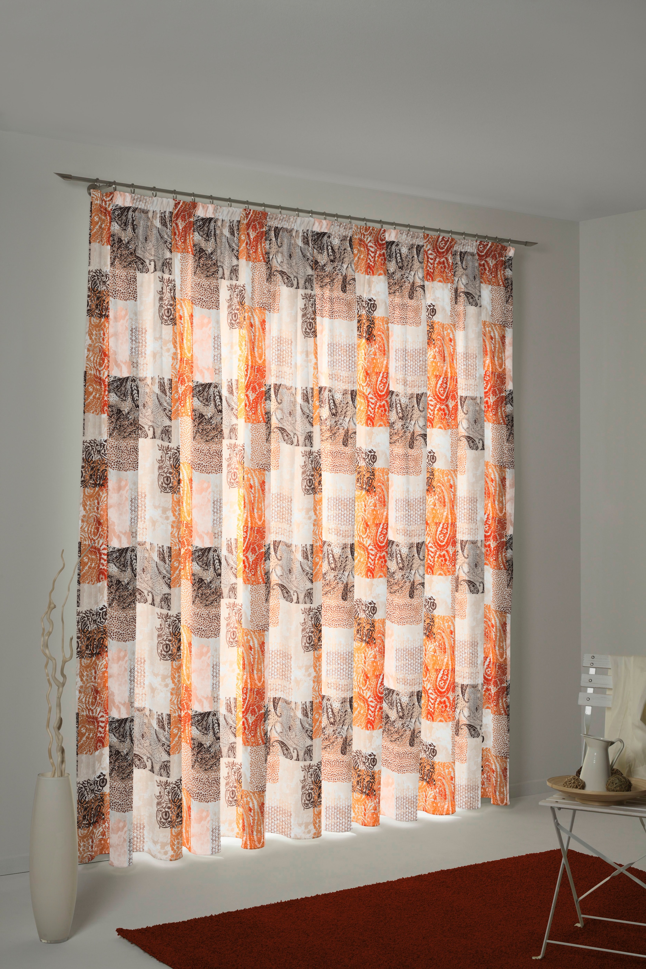 - Aufhängung: Mit Kräuselband für gleichmässige Faltenlegung und flexible Aufhängung