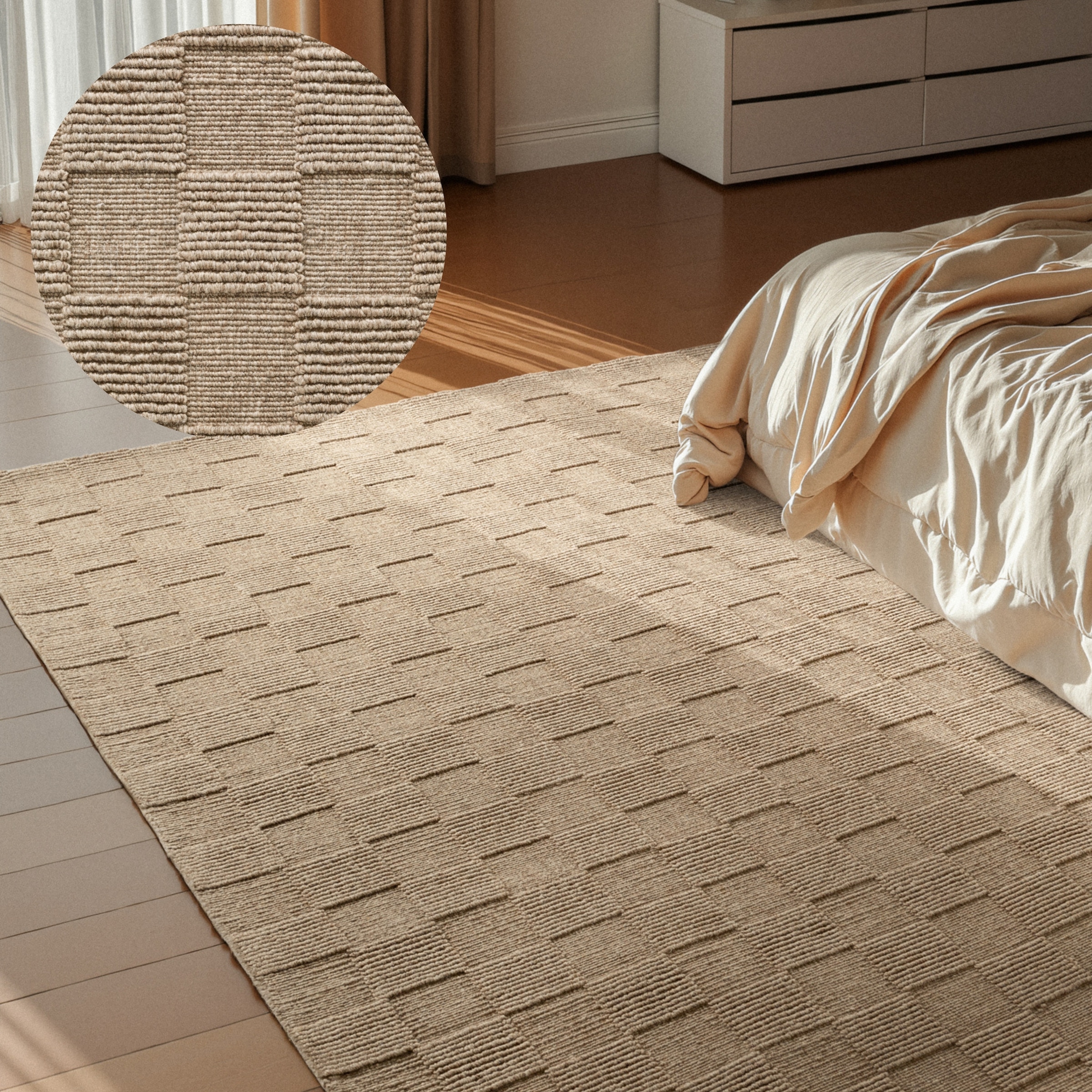 Hinweis Material | Bitte saugen Sie Wollteppiche immer ohne den Einsatz von Bürsten, so erhalten Sie die natürlich-schöne Optik. Da Schurwolle elastisch ist, können sich Druckstellen im Flor wieder aufrichten. |