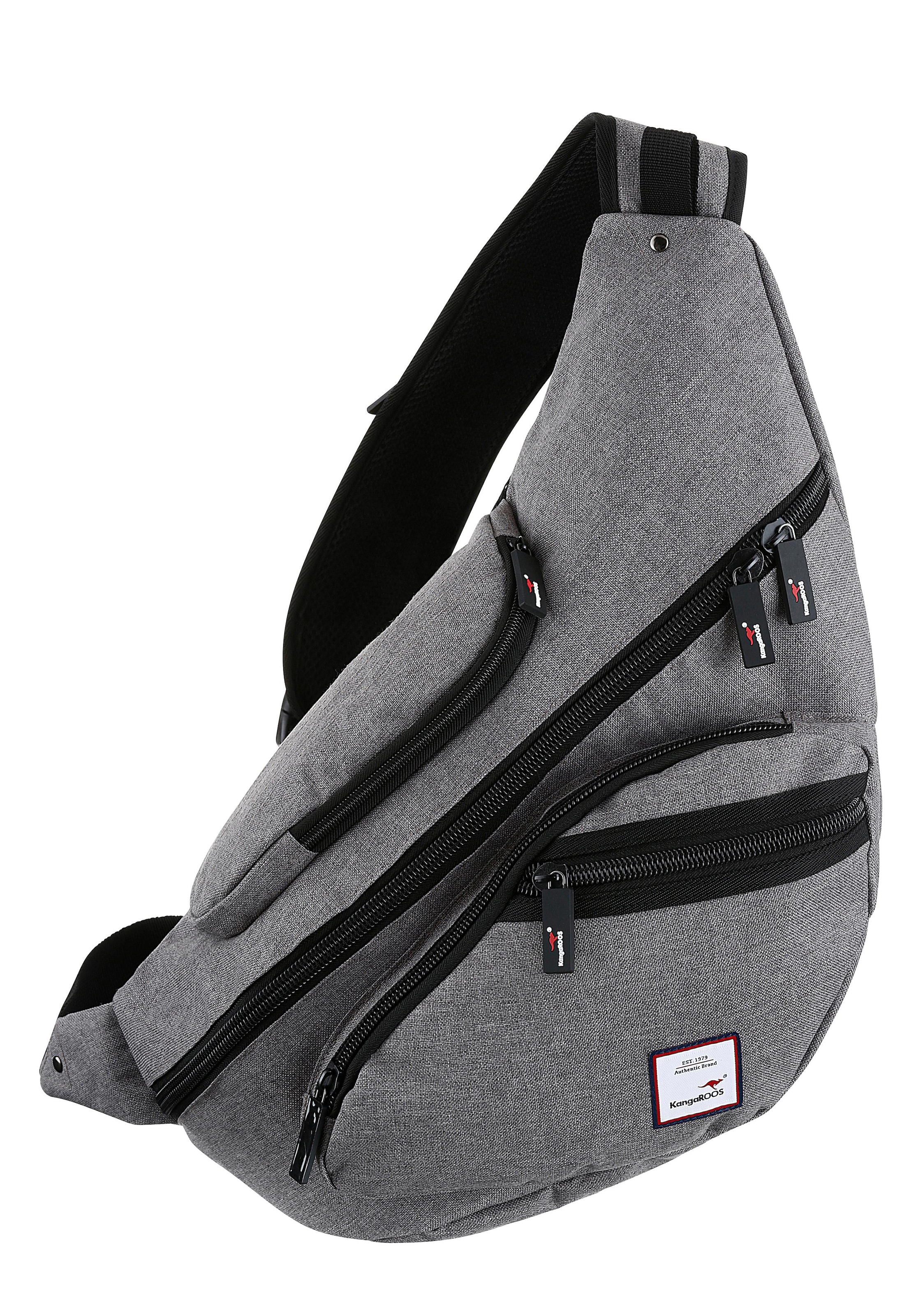 Kangaroos Umhängetasche aus Nylon. Grösses RV-Hauptfach mit RV-Innenfach. Kleines RV-Hauptfach mit Schlüsselkarabiener. RV-Vorfach. Seitliches RV-Fach. RV-Handyfach mit Kopfhörerausgang im Schultergurt. Verstellbarer Schultergurt. Gr. ca. B/H/T 54/29/17 cm.