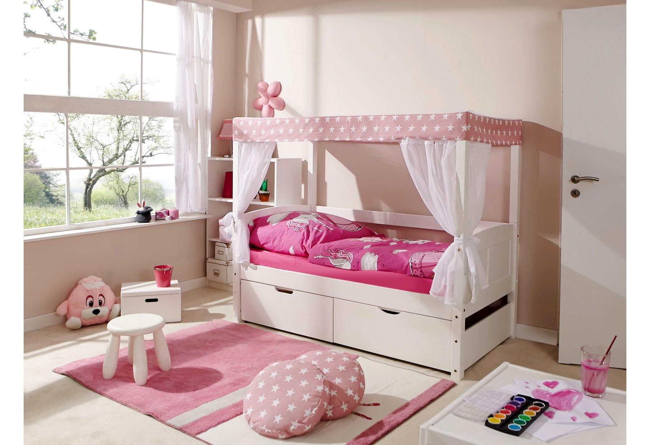 Ein Traum für Kinder. Das mini Himmelbett bestehend aus Rollrost, Matratze und Textil-Set. Die 2 Bettschubkästen sorgen für zusätzlichen Stauraum unter dem Bett.