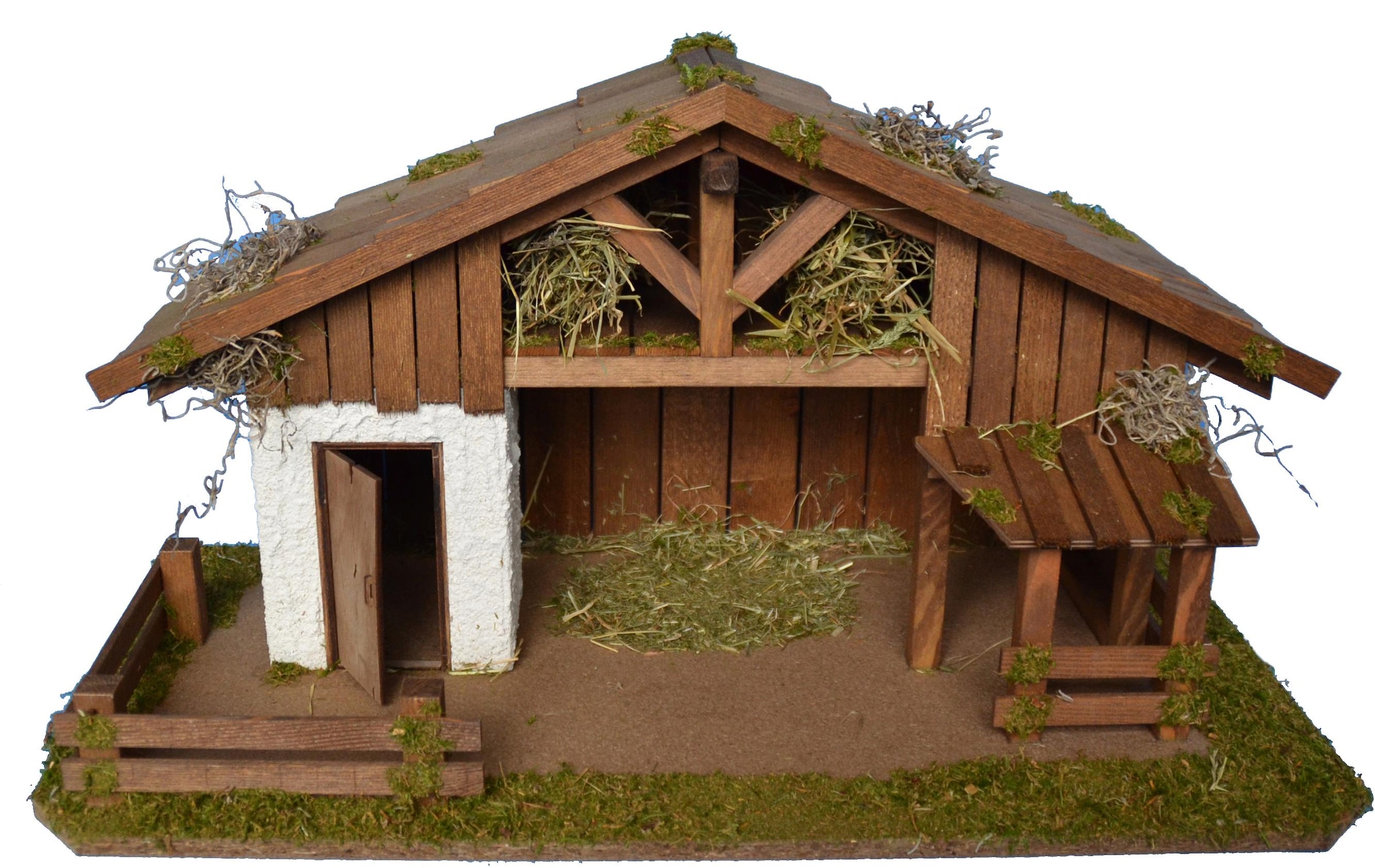 Das Dach wurde mit Schindeln gedeckt und der gesamte Krippenstall ist mit Moos, Steinen und Heu dekoriert. Die Krippe ist für Krippenfiguren mit einer Höhe cm bis 12cm besonders gut geeignet.
