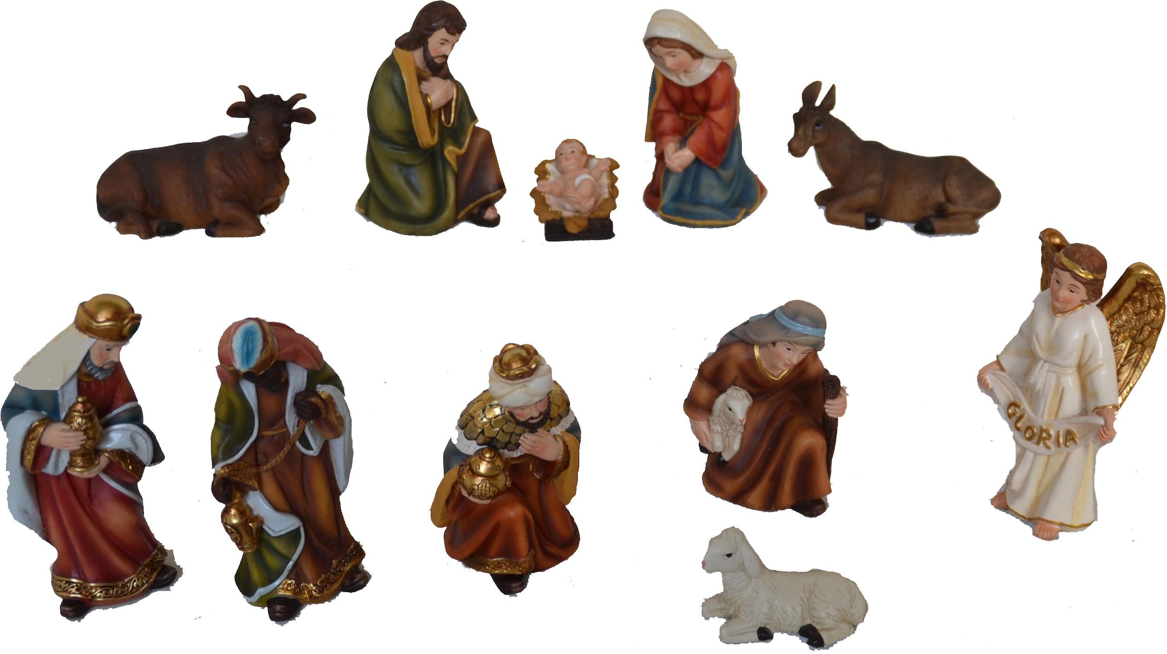 Krippenfiguren, sehr naturgetreu, mit Liebe zum Detail gestaltetes Figuren-Set für die Krippe. Aus Polyresin gefertigt. 11-teilig: Maria, Josef, Jesuskind, Heilige Drei Könige, Hirte mit Schaf, Esel, Ochse, Engel »Gloria« und Schaf. Höhe 11 cm. Material: Polyresin.