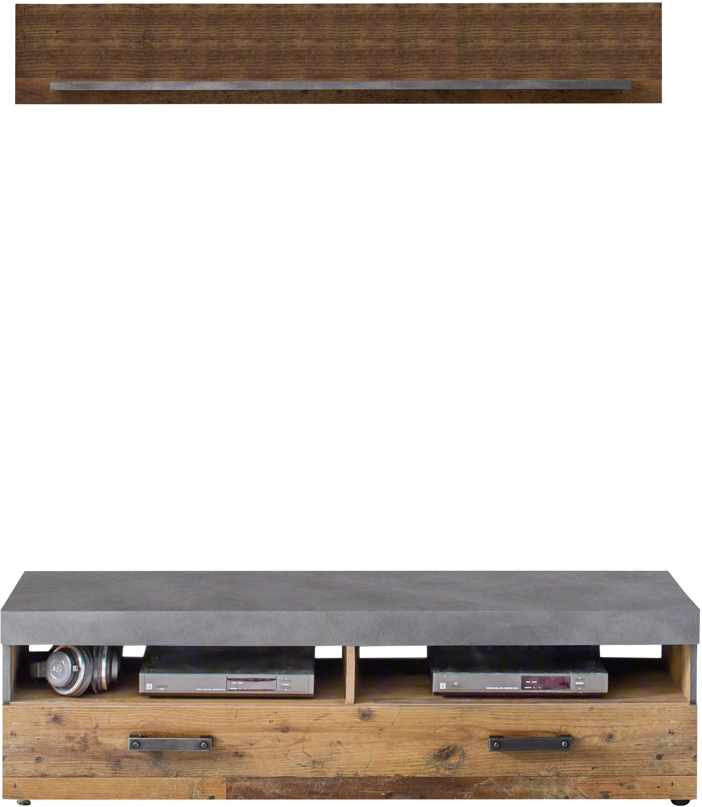 Mit ansprechendem Design und durchdachter Aufteilung überzeugt die rustikale Wohnwand »Ilana« der Marke Inosign. Die Kombination besteht aus einem TV-Lowboard und einem Wandboard, die sich beide harmonisch aufeinander abgestimmt sind. Konfektioniert sind die Wohnzimmermöbel im Bi-Color-Look. Im Zusammenspiel aus Holzoptik mit sichtbarer Maserung und gewollten Gebrauchsspuren sowie den farblich abgesetzten Elementen entsteht ein Gesamtbild im Industrialstyle. Das Lowboard bietet im Hauptfach hinter der Klappe Stauraum für die DVD-Sammlung, Fernbedienungen und weitere Utensilien. In den offenen Gerätefächern ist Platz für den Receiver oder den Blu-Ray-Player vorhanden. Das Wandregal bietet sich für Dekoaccessoires oder Bücher an. Gefertigt wird die Wohnkombination aus FSC®-zertifiziertem Holzwerkstoff mit pflegeleichten Oberflächen. Eine dekorative und funktionale Bereicherung für das Wohnzimmer ist die rustikale Inosign Wohnwand »Ilana«.
