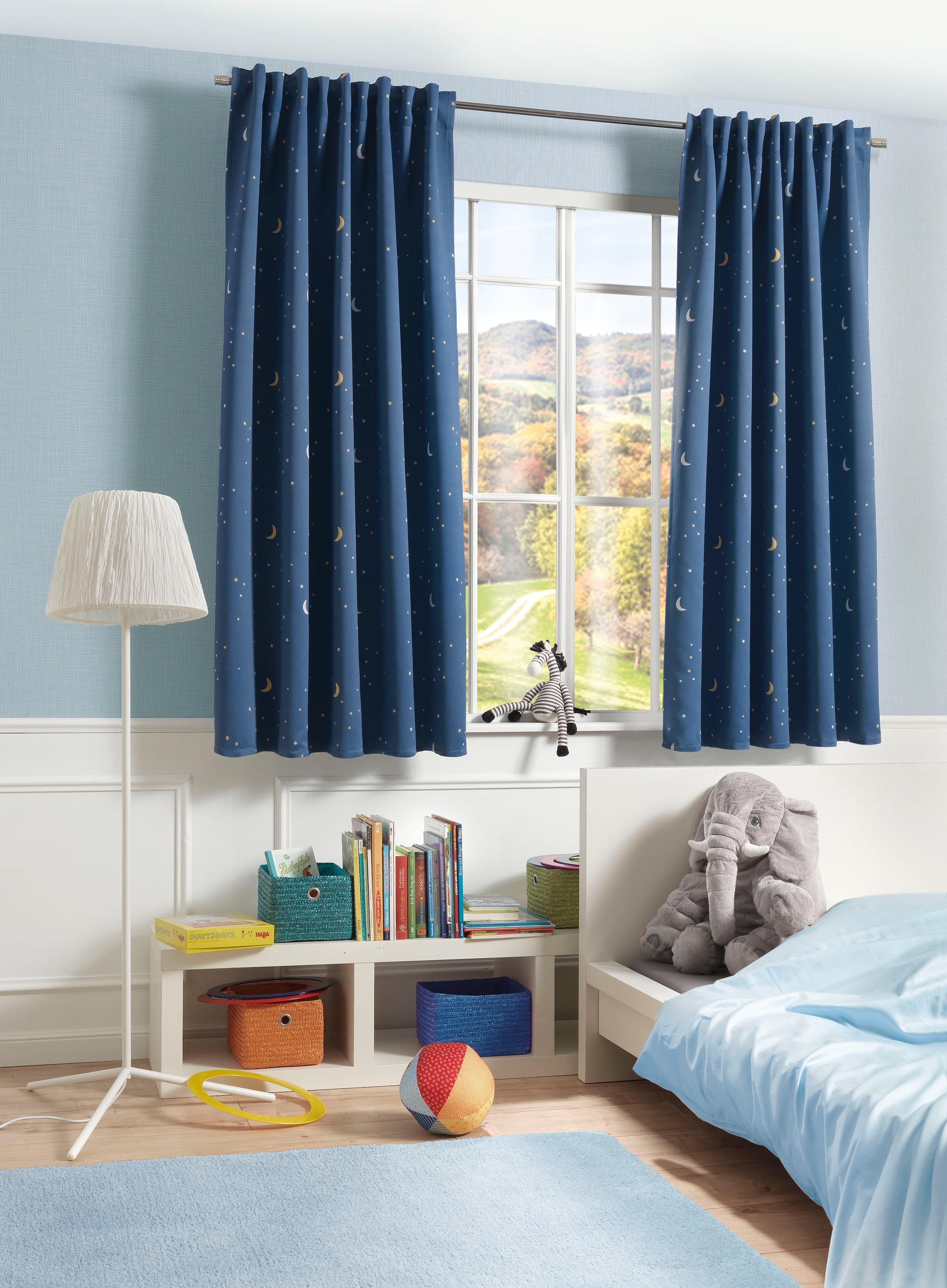 Gute Nacht liebe Kinder! Der bedruckte Funktionsschal 085007 zeigt ein schönes Sternenhimmel-Motiv auf dem Verdunklungsstoff. Dadurch hat man auch bei schlechtem Wetter einen traumhaften Nachthimmel im Ambiente. Oben ermöglicht das Multifunktionsband die Aufhängung an Gardinenstange (verdeckte Schlaufen) und Gardinenschiene (Gleiter nicht im Lieferumfang). Wer Kinder hat, weiss auch die Höhe des Schals zu schätzen! Die Höhe des Schals (175 cm) wurde bewusst so gewählt, damit Kinder den Vorhang nicht von der Stange reissen. Aus Verdunklungsstoff - zu 97-99% verdunkelnd. Pflegeleicht, Waschbar - Aus 100% Polyester