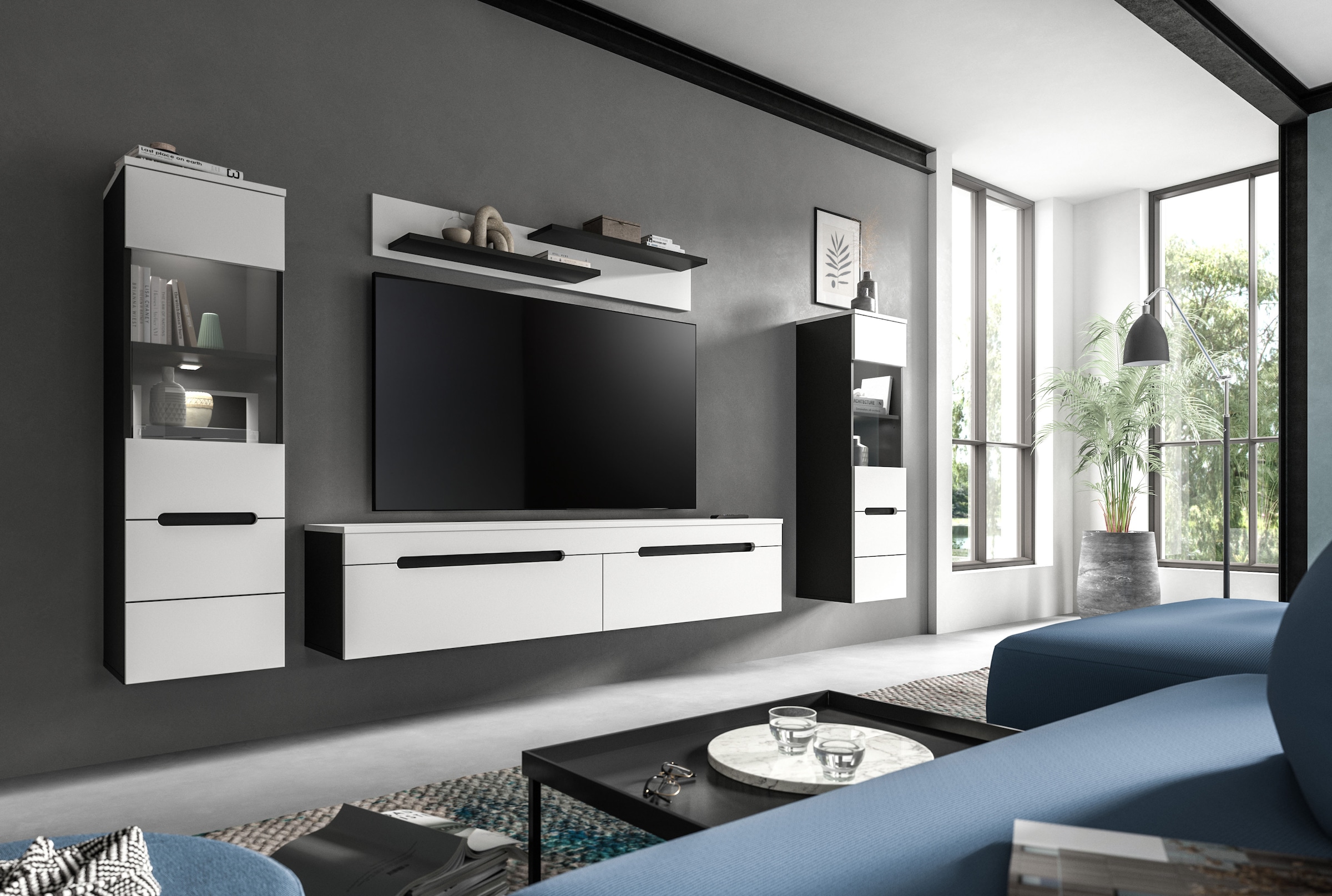 Solche mehrteiligen Wohnwände wirken dank der einheitlichen Gestaltung wie aus einem Guss und bringen zugleich Abwechslung in den Raum. Dafür sorgen die unterschiedlichen Höhen der einzelnen Elemente, Glaseinsätze oder Materialmixe, etwa in Form von Holz und Hochglanzoberflächen. Wie Sie die Möbel arrangieren, bleibt Ihnen überlassen: Wandregale passen zum Beispiel über den Fernseher oder daneben, Wandschränke lassen sich für ein aufgeräumtes Bild in einer Reihe oder kreativ in verschiedenen Höhen befestigen. So lassen Sie Ihren Vorlieben freien Lauf und gestalten eine individuelle Wohnwand nach Wunsch.